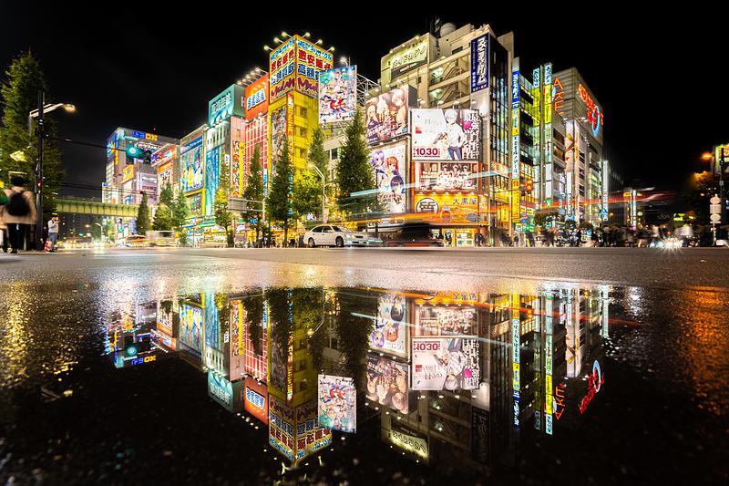 After a heavy rainfall I captured the reflections of Tokyo Lights in a puddle on the road.