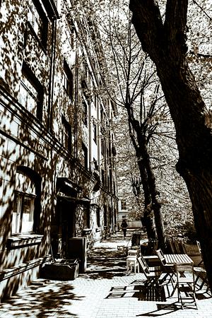 My girlfriend and I were sightseeing in Riga, Latvia, when I saw her walk into this lovely web of hard shadows...